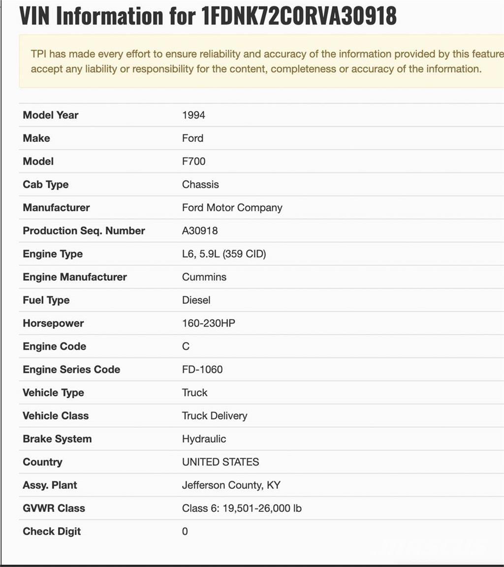(USED / REPAIRABLE) 1994 Ford F700 CAB For Sale, VIN: 1FDNK72C0RVA30918, CAB Type: Chassis, GVWR Class 6: 19,501 - 26,000, ***COMES AS SEEN IN PHOTOS*** Stock # 7962