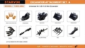 (1) 8 in Bucket, (1) 24 in Bucket, (1) 32 in Bucket, (1) 8 in Auger, (1) 12 in Auger, (1) Quick Coupler, (1) Rake , (1) Ripper, (1) Grapple, (1) Set of Bucket Teeth w/ Side Cutter